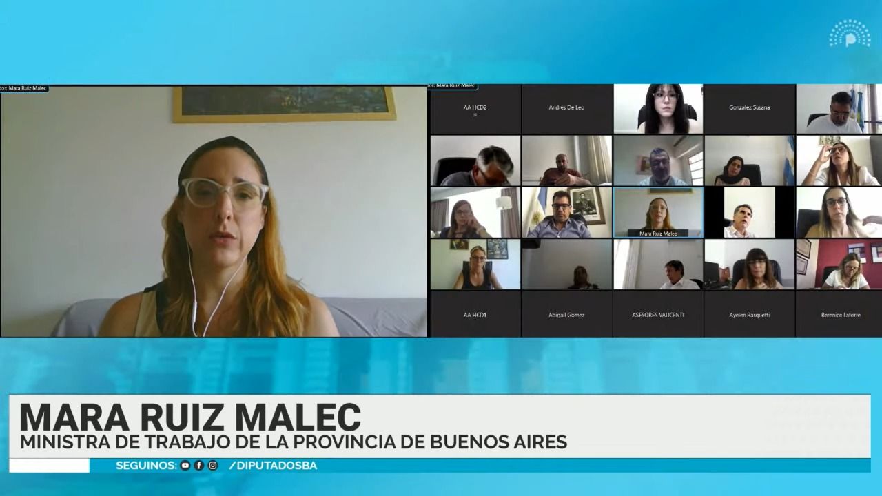 La ministra de Trabajo de la Provincia, Mara Ruiz Malec, explicó de manera remota los alcances del proyecto de Ley de Presupuesto 2022 en materia laboral en una reunión informativa con diputados, diputadas, senadores y senadoras. La exposición fue presentada por la presidenta de la comisión de Trabajo de la Cámara de Diputados, Soledad Alonso.
